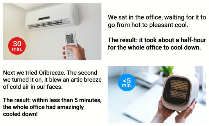 OUR STORY STARTS HERE: THE AIR CONDITIONER INDUSTRY HAS BEEN RIPPING PEOPLE OFF FOR THE PAST DECADE. 3 big companies. They could set any price they wanted, pushing a mediocre product. Their main product: traditional Air Conditioning Units. They are outdated, expensive, noisy, dangerous to clean, and cost a fortune in electricity. AND you can’t move them around the house! As portable alternatives, the AC industry has been promoting fans. Yes, they are cheaper, but they only blow the air around. What if the air is hot? It will just make you feel hotter. Could things get worse for Australians? SADLY YES – the national weather services are reporting that it is going to be a super hot summer, one of the hottest for decades. Meaning the electricity bills will skyrocket in a few months! Could this new type of cooling technology be the savior? Meet OriBreeze. The company behind the OriBreeze recruited leading industry engineers to change everything we know about Air Conditioners. Their goal was to make a low-cost, low-maintenance AC unit that is suitable for any home, office or car. And they succeeded! OriBreeze has stunned the $135B AC industry with their innovative model. Why? Compared to the traditional AC, it’s 300% more efficient, smaller, portable, and it cools any room much faster- in less than 5 minutes! OriBreeze utilizes a new Insta-Cool™ Technology Cooling System that allows everyone to make hot rooms & sky-high energy bills a relic of the past. Based on recent data, it saves 50-75% of electricity compared to traditional air conditioners. It’s safe to say, OriBreeze is the next generation of AC units! We had to put these claims to the test. Our verdict? There’s NO comparison, the OriBreeze is the clear winner. And it makes sense… OriBreeze’s technology is much faster because it uses water to cool down the incoming air, and then it pumps out freezing cold air on the other side. Just fill up the 300ml/10.1 oz tank with water and press the start button! Which brings us to the big question… Simply fill the 300ml/10.1 oz tank with water. Turn it on, The Insta-Cool™ Technology Cooling System will turn hot muggy air into icy cold air in seconds. During our tests, we found out that just one fill of the OriBreeze tank can last for an entire day! In addition, the OriBreeze offers 3 modes to control the temperature of your room: Low Mode – a relaxing cool breeze; Medium Mode – for if you’re feeling warm; Turbo Mode – for if you need to cool down any space fast. The best part? You can run it using any USB-C port – even your laptop could power it! This means you can take it to any room you want, the office, garage, kitchen… Get instant relief from the heat wherever you go. Now you and your family can stay comfortable and cool without having to worry about your electricity bills or power outages. The OriBreeze technology and its unique features speak for themselves: Set your mode – create a gentle breeze or switch turbo for instant cool. Whichever you like & need for the moment. Air quality control – it can act as a humidifier. If you want a clean, fresh, and humidified air, OriBreeze can provide this for you. Fast and efficient – OriBreeze generates REALLY COOL AIR, FAST! In just seconds enjoy Rapid Cooling as OriBreeze pumps out refreshing air. Different speeds – 3 fan speeds. Set it to your optimum comfort level. Easy to use – very easy to refill with water when it runs low. Big capacity 300ml/10.1 oz tank. Lightweight – compact and easy to carry. Weighs less than 2 kilograms. Extremely quiet – No loud, obnoxious fan noise to disrupt your concentration or sleep. Full control – Adjustable vents to direct cool air wherever you want it. No-hassle installation or maintenance – OriBreeze requires no installation or regular maintenance. Just plug it in and enjoy! …and that’s not all! When you’re inside all the time, indoor pollution only gets worse. Even particles from your clothes and hair travel the air. When the temperature rises, certain pollutants are more likely to be released indoors, which can affect the air quality in your home. So, it’s important to stay aware and take steps to keep your indoor environment clean and cool, especially during those hot summer days! Q: Does OriBreeze require any installation? Q: Do I need to buy my own batteries? Q: Is the OriBreeze safe to use when sleeping? “We’re disgusted by how greedy the big AC industry is and we wanted to give them the middle finger. So…” And here’s where the story gets even more interesting… As we all know, traditional AC units go for $800+ without the installation and maintenance, so you would expect the OriBreeze to cost around as much… But the founders decided to retail the OriBreeze for the friendly price of $59.99 (regular price $119.98) with a big 50% discount – and it already sold out x3 this summer in Australia! EVEN BETTER, if you order more – you get a bigger discount. The best-seller 3-pack of OriBreeze Air Coolers goes for just $47.49 each. THAT’S A BIG 70% OFF. Click here to claim a discounted OriBreeze (if it’s still available) >> If you ask us, that’s a tiny price to pay for a brand new, ultra-efficient AC keeping you cool this summer. In the words of the founders: “Did you know big brands spend BILLIONS on advertising, physical stores, and boss bonuses? Can you guess who’s paying for that? Yep, YOU, the customers… At OriBreeze, we spend nothing on any of this. We sell online and on trusted retailers, don’t advertise on TV, and we’re no greedy owners who demand ridiculous bonuses. We prefer to let our devices and positive reviews do the talking for us!” The answer is a certifiable YES. With summer around the corner, the OriBreeze is the cheapest and best way to stay cool and comfortable. It feels like a $800 product priced at $44.37 (with your exclusive 75% discount). Our advice? Get your OriBreeze now before this discount runs ou